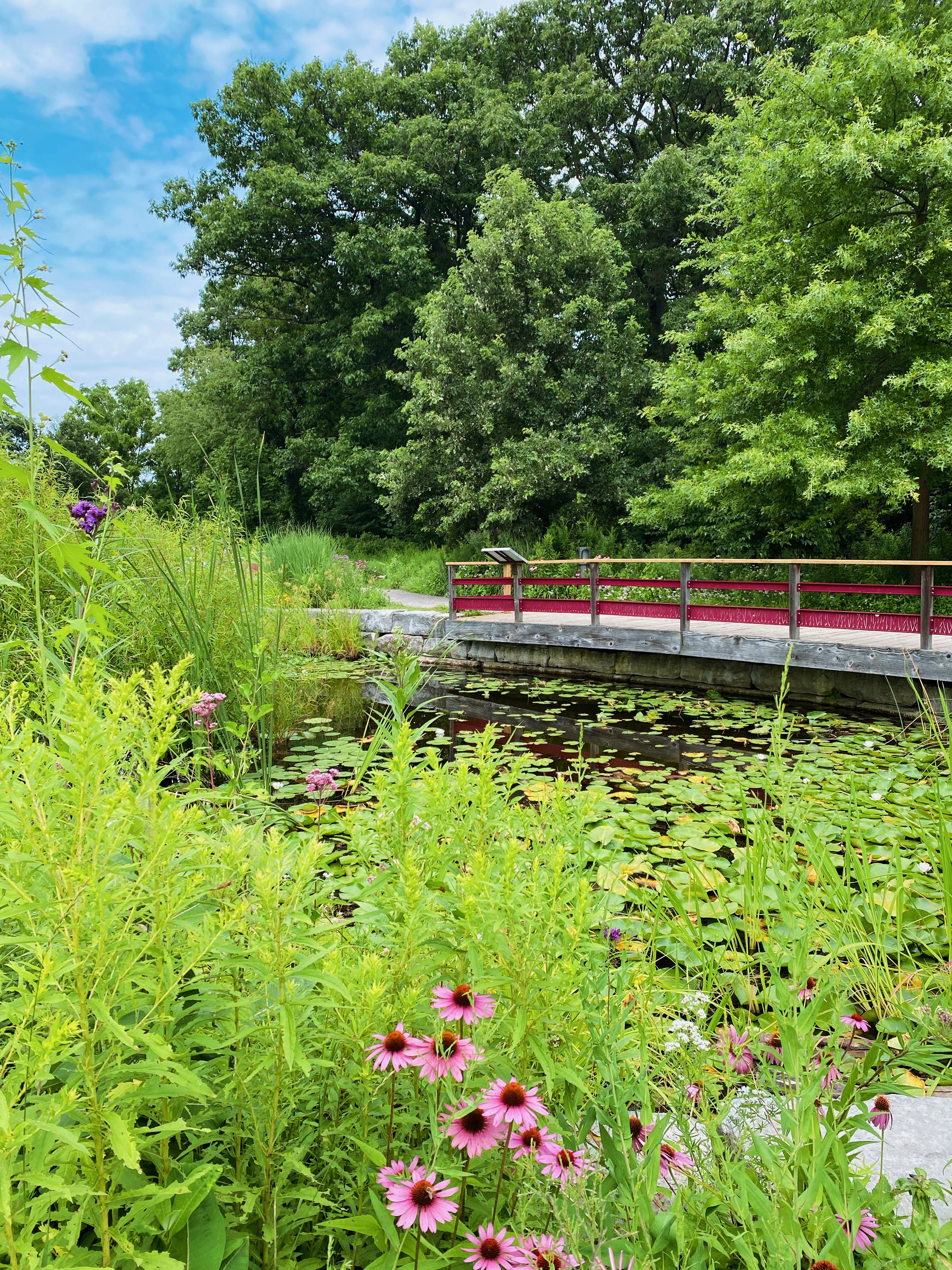 The Helen M. Kippax Garden features over 135 native species of trees, shrubs, perennials and grasses. There’s a small bridge that takes you over a lilypad-covered pond, and benches where you can sit, have a quiet moment, and take in the serene surroundings.
