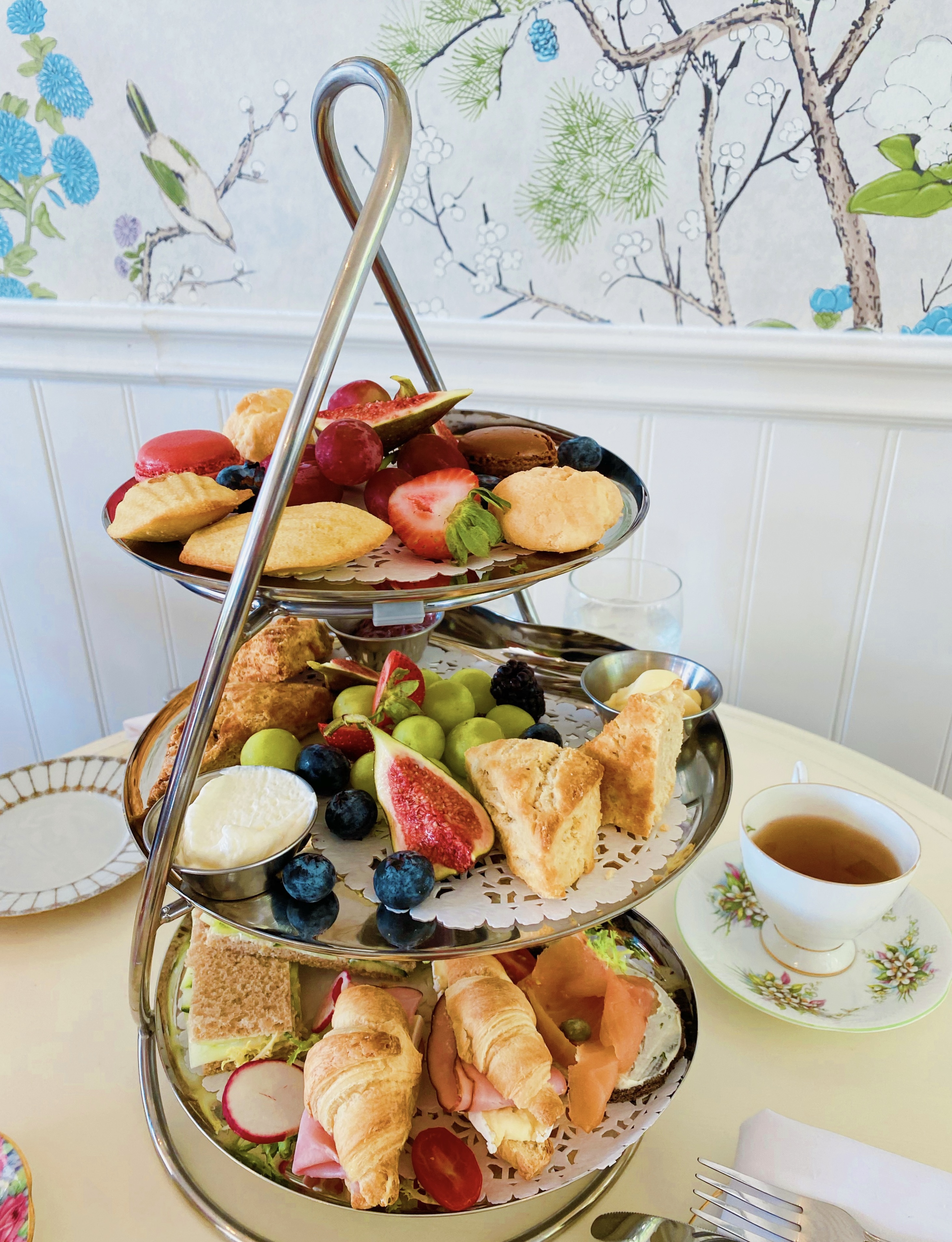 After we’d enjoyed a cup or two, the food arrived. The tea tray for two includes eight finger sandwiches, four scones, six miniature desserts, and a selection of fresh fruit. There are four different sandwich varieties, so you get two of each. The fillings include curried chicken salad, cucumber-cream cheese, ham and Brie (served on a mini croissant – my personal favourite) and smoked salmon with capers, served open-faced (I adore smoked salmon, so this was a close runner-up!) The scones were on the smaller side but very yummy, and came served with whipped honey butter, lemon cream and strawberry jam. The desserts included two cream puffs, two madeleines and two macarons: one raspberry and one chocolate. My mom and I split the macarons in half so we could try each flavour – both were good, but the chocolate was the definite winner!