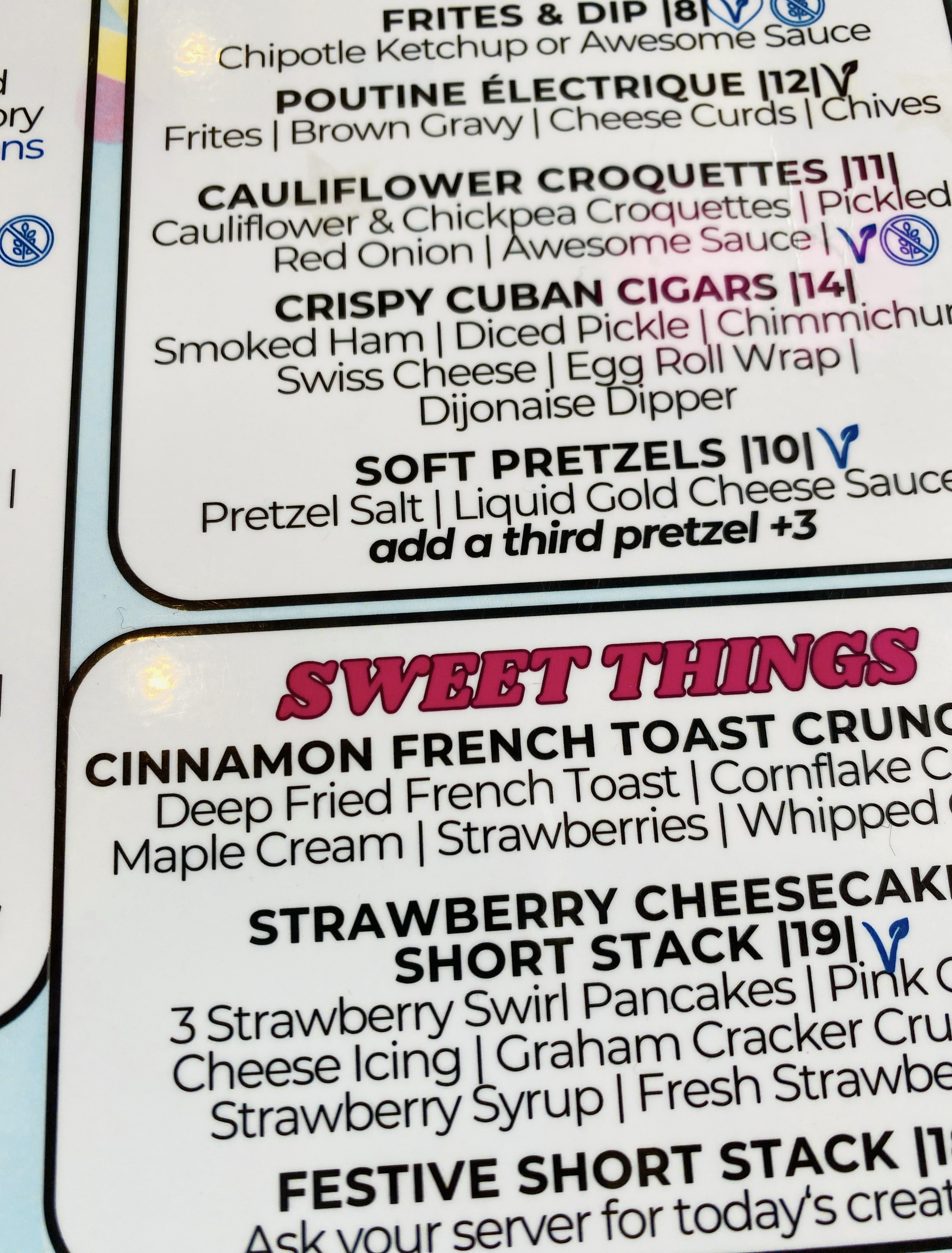 I sipped a vanilla latte while we decided what to order. As soon as you open the restaurant’s menu, you’ll see that the 80s theme isn’t just reflected in the decor… it carries over into many of the dish names too, from the Axel Foley Burger to the Boy George Sandwich. You’ll also notice some rather intriguing and creative takes on classic brunch dishes. For instance, the Grilled Cheese Benny – eggs benedict with tomato soup hollandaise, served on mini grilled cheese sandwiches – or my personal favourite, the Cinnamon French Toast Crunch. If you didn’t think French toast could possibly get any better, imagine what happens when you batter it in cornflake crust and deep-fry it? (Magic. That’s what happens.)