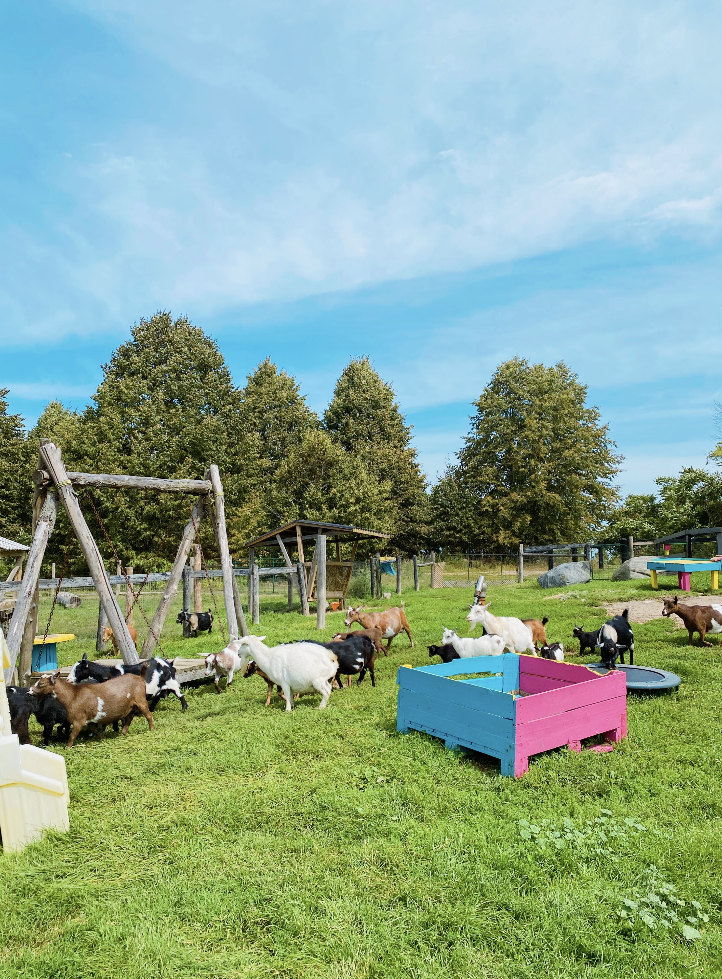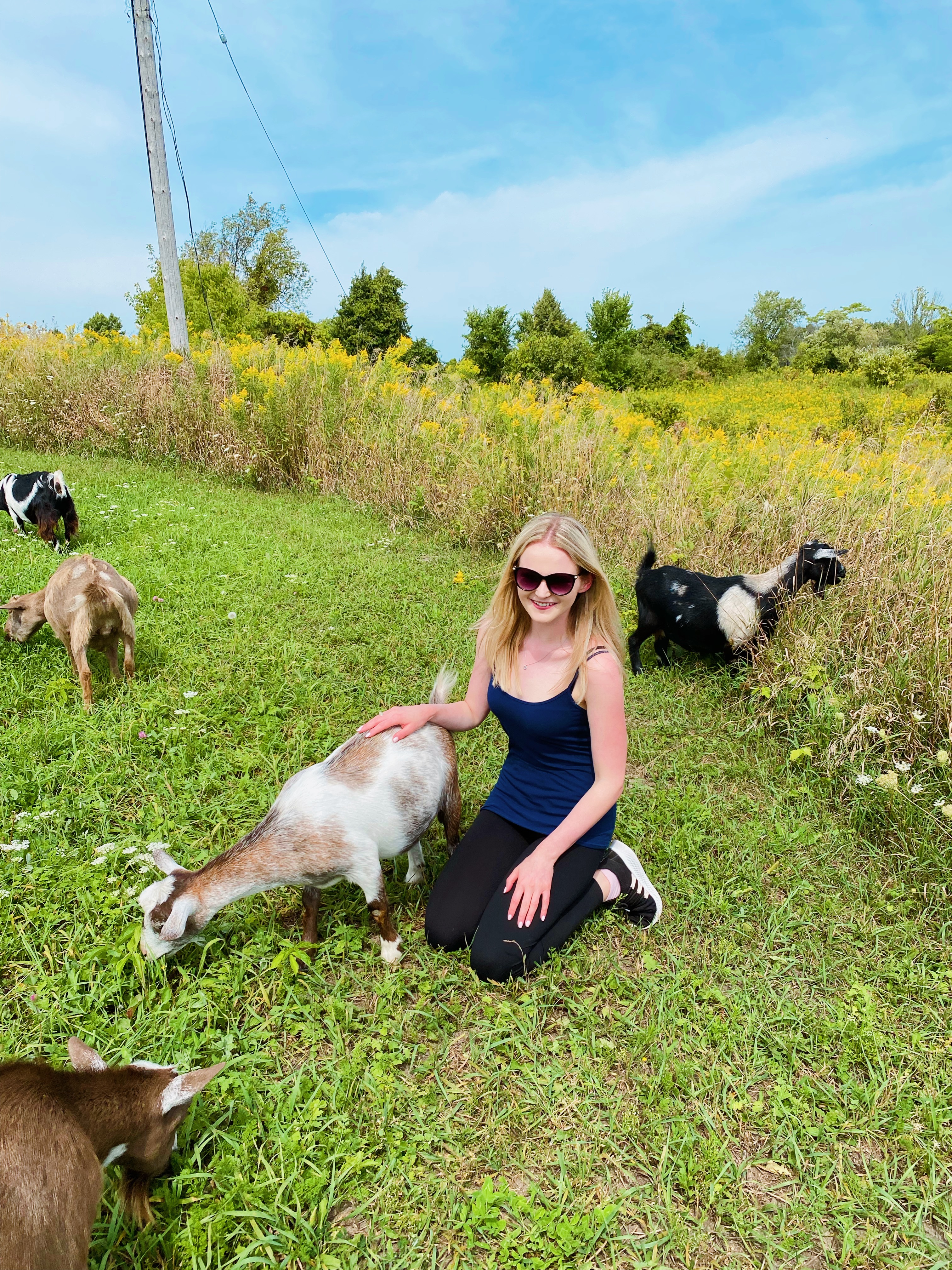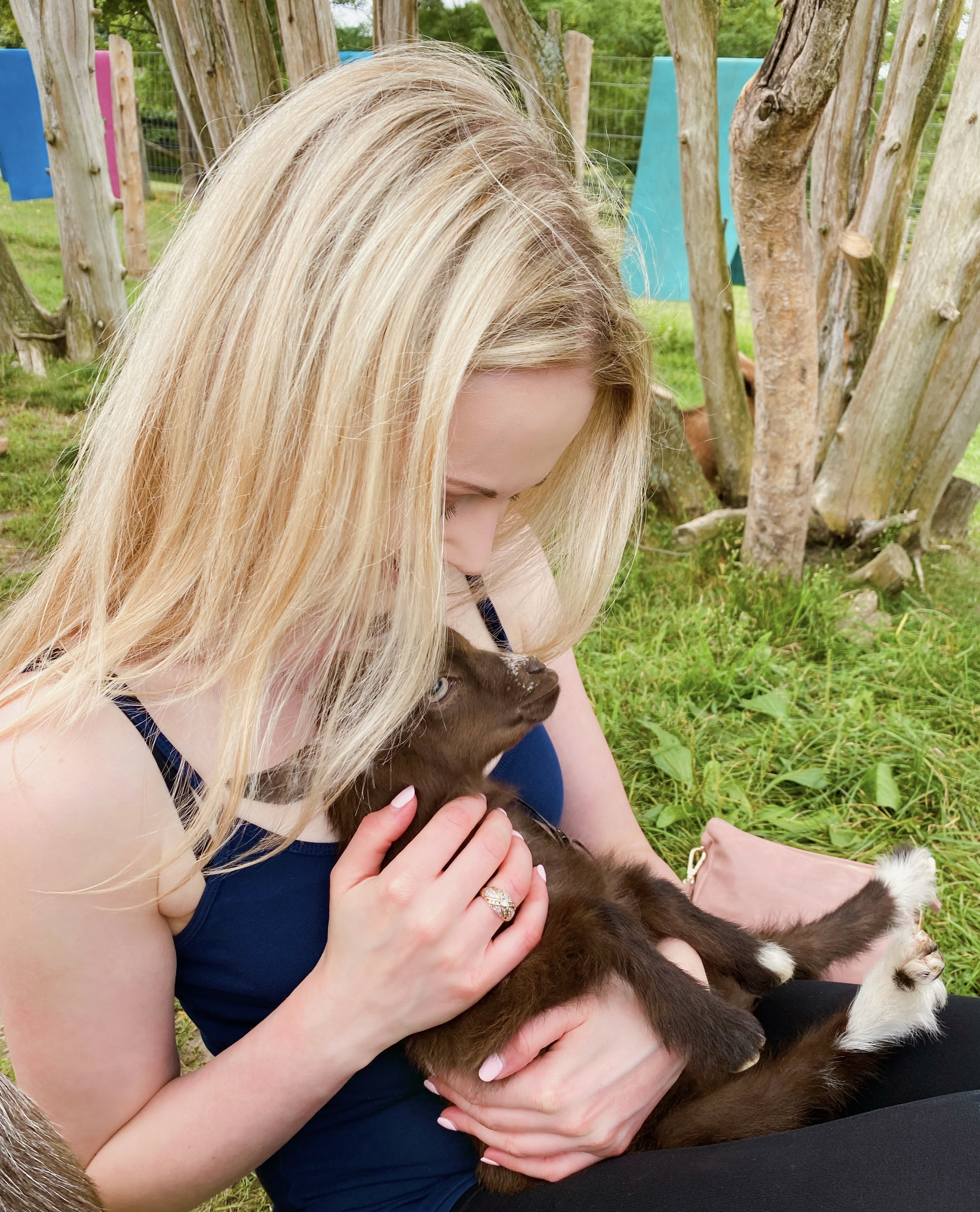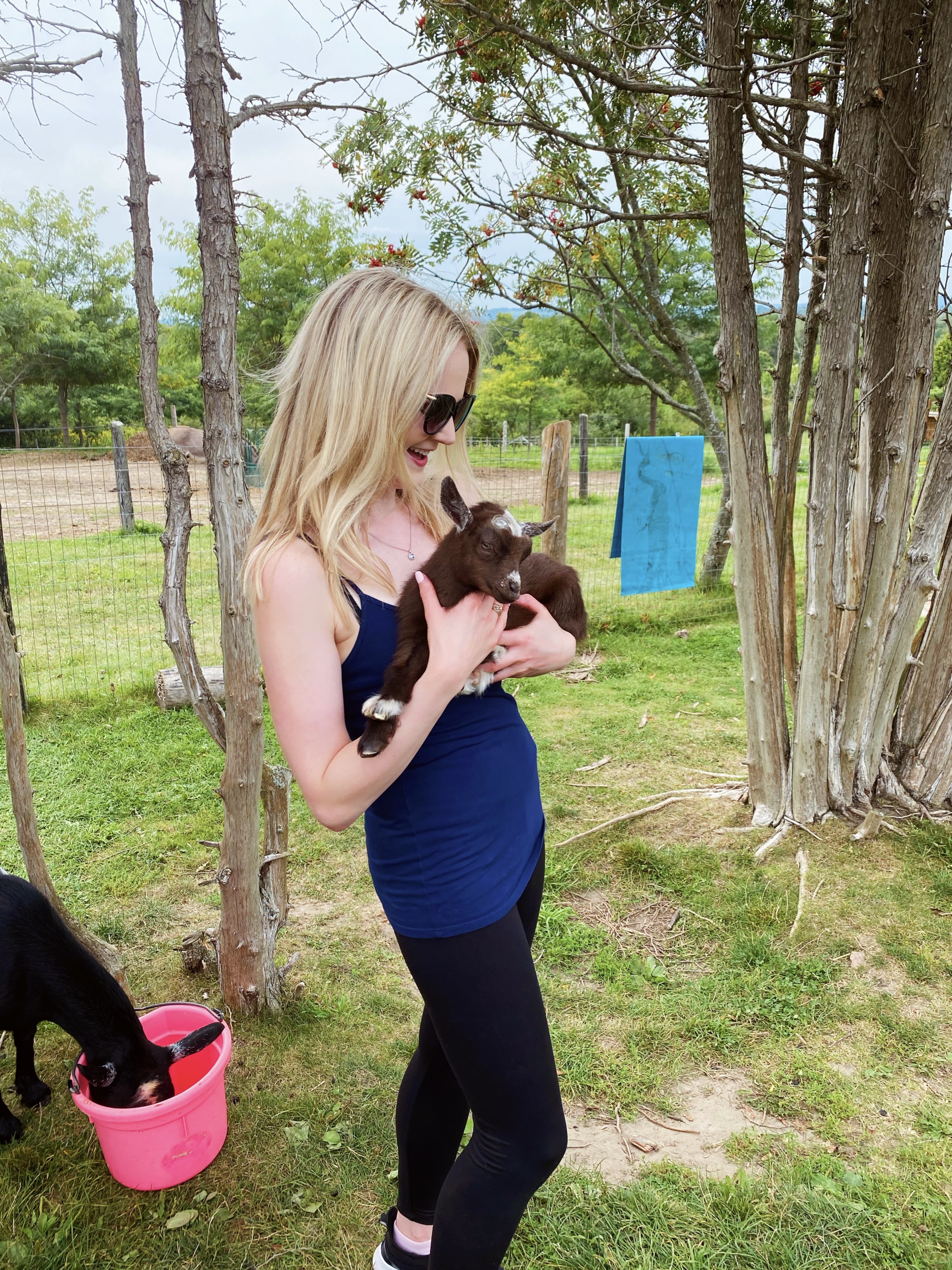 Getting the goats back in their enclosure was the hardest part and definitely took a team effort, but eventually all goats were accounted for! Now that the walk was over, we settled into the “Goat Playground” for the remaining half hour of the experience, the “Shmurgle” itself. “Shmurgling” is Haute Goat’s term for snuggling, cuddling, hugging, petting and playing with the goats, and it’s honestly one of the cutest things I’ve ever experienced. My favourite part was getting to hold Boots, one of the farm’s baby goats. She was so cute and snuggled right into me. Apparently the babies like being held close to your chest because it makes them feel safe and secure. (How sweet is that!?)