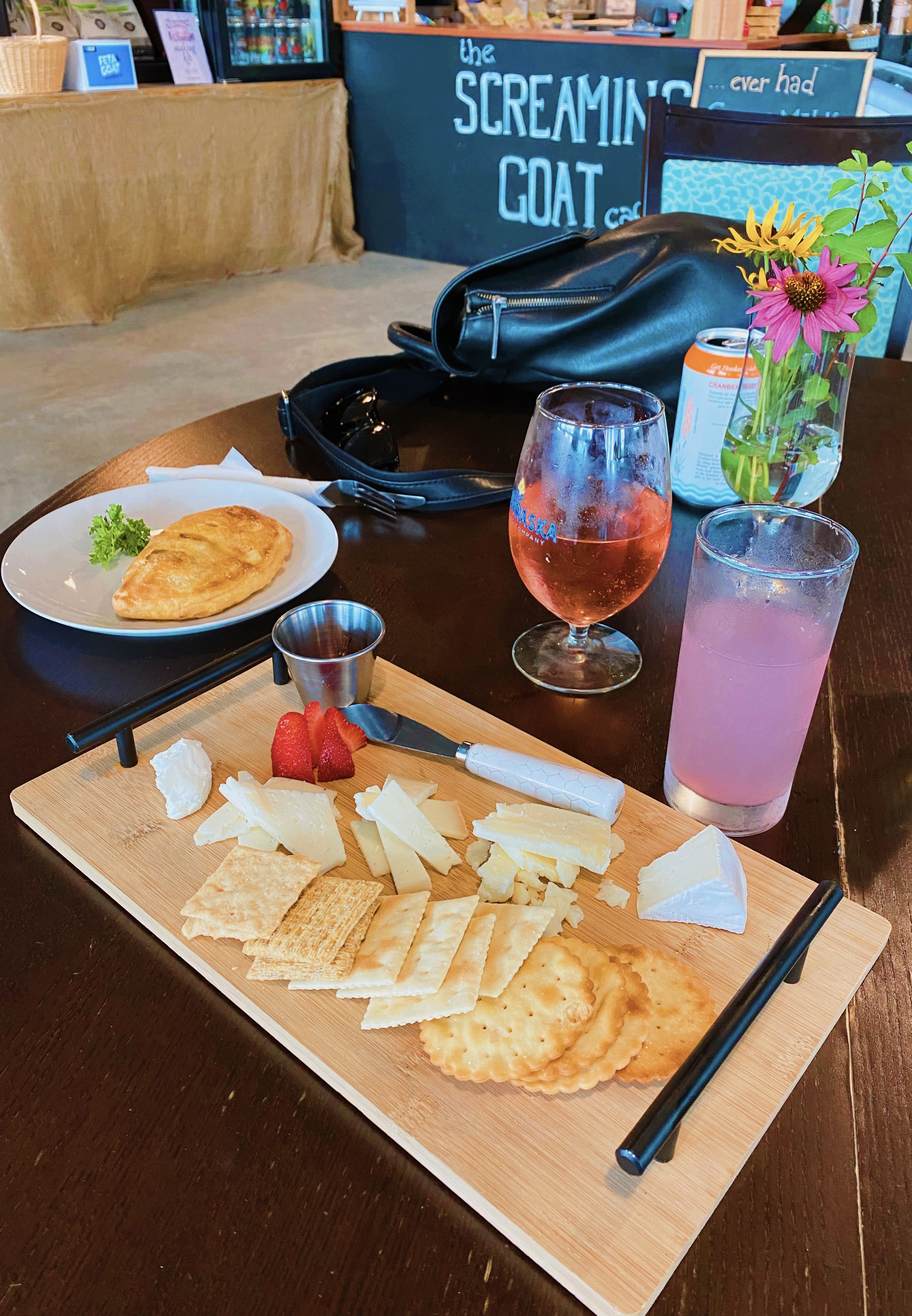 The same building houses the Screaming Goat Café, where visitors can refuel after an action-packed day at the farm. I ordered a pink lemonade and a grilled goat cheese sandwich, served on sourdough with tomato oregano sauce (so much better than ketchup!) and potato chips. Victoria got a cider from Ganaraska Brewing Company and a brisket hand pie. We also ordered a cheese flight, which includes five different varieties of goat cheese served with crackers, jelly and strawberries. The food was all very good, and I especially loved the cheese flight. It’s just $10, which is a steal when you think of how much other places charge for charcuterie boards!