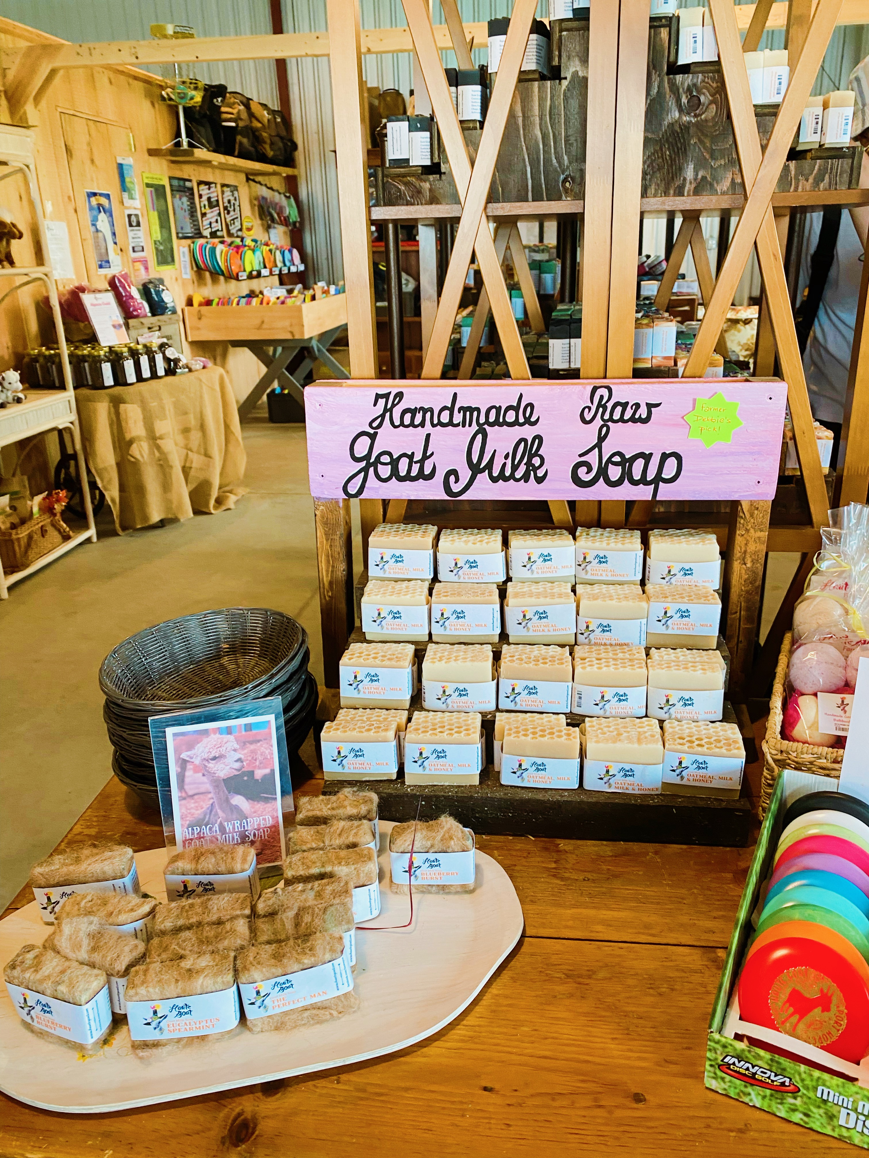 After the Knuffle Shuffle, we went to check out the farm store, which sells Haute Goat branded merchandise along with various items handmade from alpaca wool (socks, mittens, dryer balls) and goat milk (soaps, creams, lip balms.)