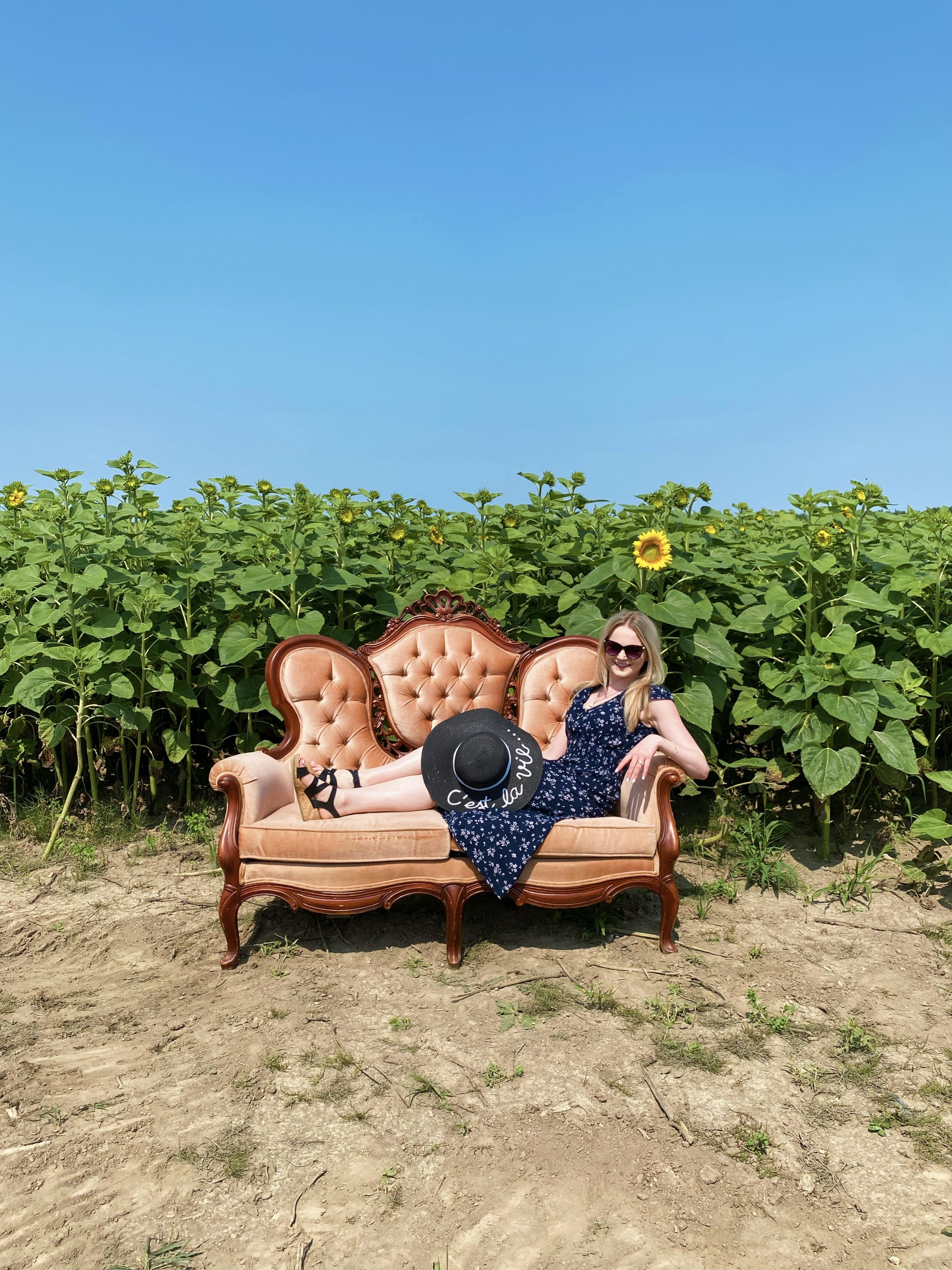 We arrived at the farm around 11 am, and the first thing we did was go for a scenic stroll through the sunflower fields. They’ve created a winding maze (don’t worry, you won’t actually get lost) with fun props for the perfect photo ops. How cool is that antique sofa!?