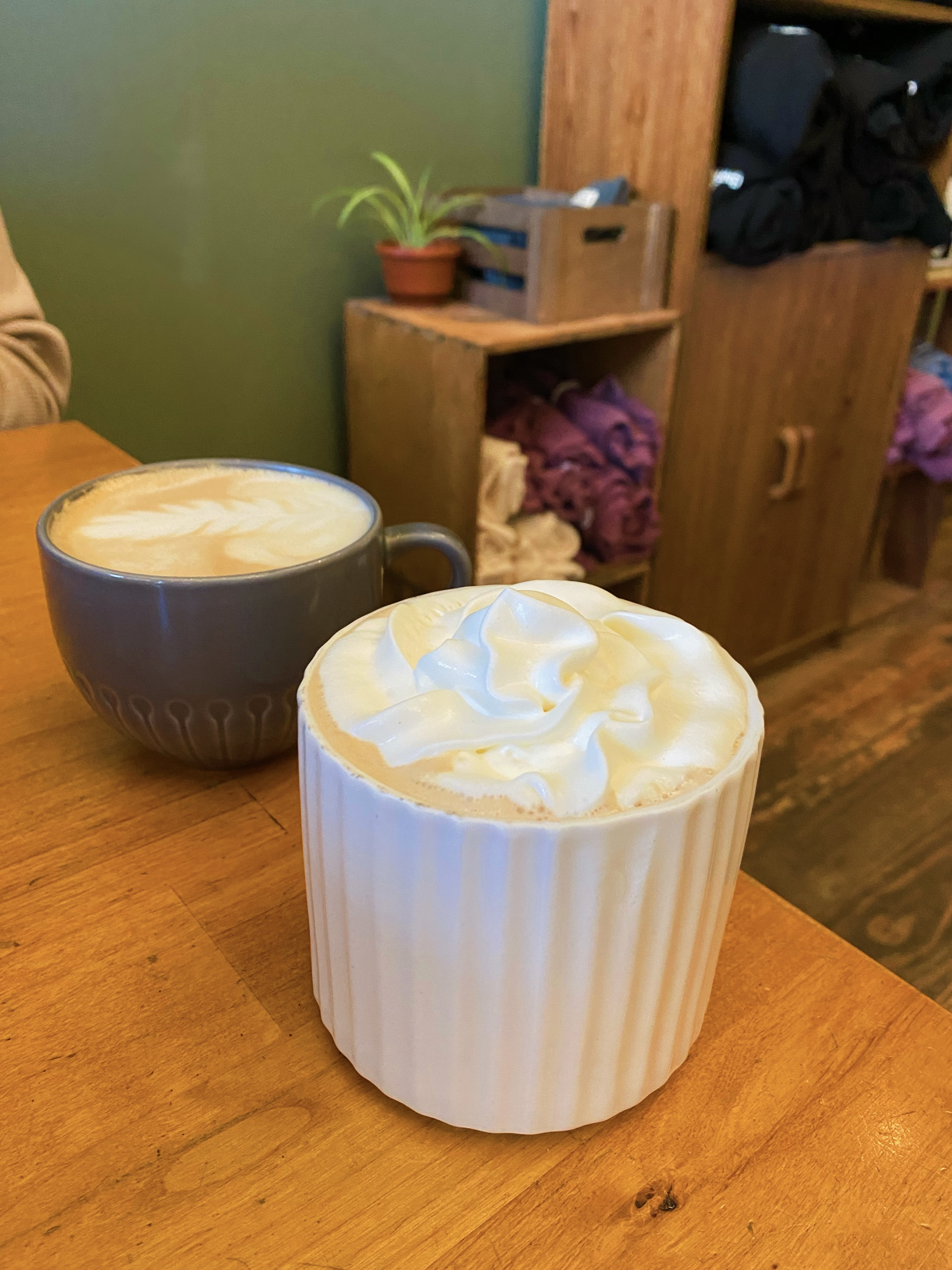 Start the day with breakfast at The Lost & Found Café. Tucked away in the Elora Mews – a quaint courtyard lined with shops and eateries – this cozy coffee shop sells pastries, breakfast and lunch entrees, and (naturally) coffee. Tania ordered her go-to beverage – a flat white – and I enjoyed one of their feature holiday drinks: a peppermint mocha. We also split the apple and brie croissant, which was very good: it’s a grilled croissant sandwich filled with sliced apples, brie and caramelized onions. The café is very small and seating is limited; we were just lucky enough to snag a shared table, but expect that you may have to take your treats to go. If you prefer a sit-down breakfast, check out Café Crêperie just across the street, which serves a variety of sweet and savoury crepes.