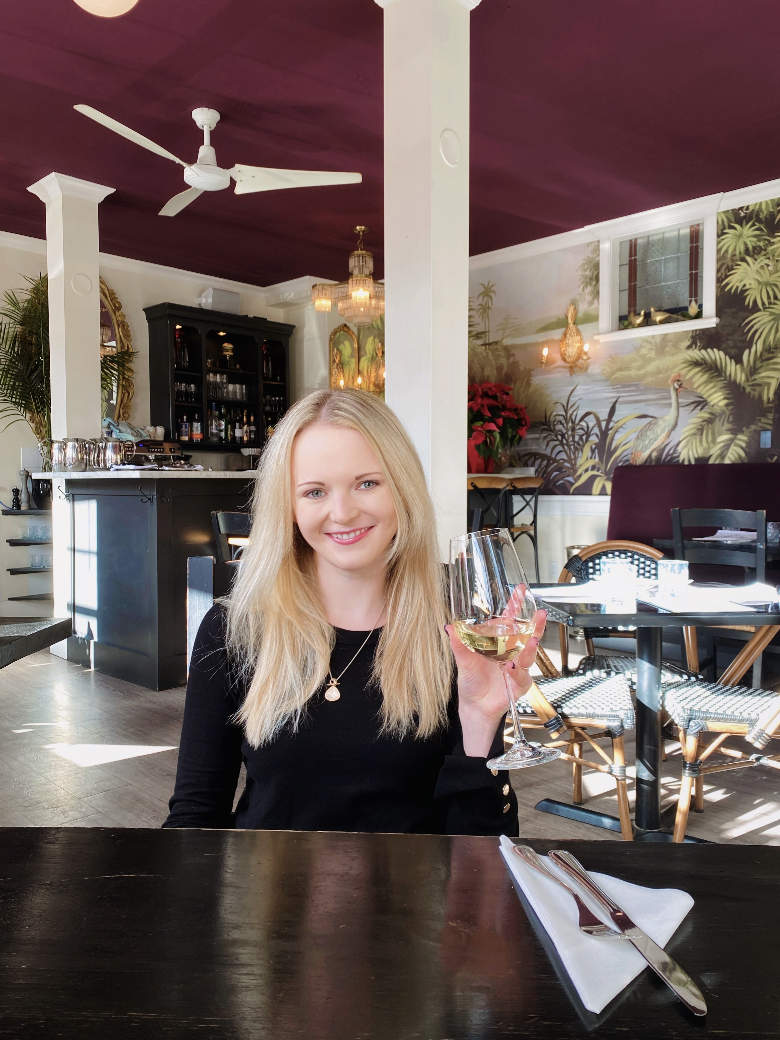 If all that shopping leaves you hungry…refuel with lunch at The Evelyn. This lovely little French bistro serves elevated takes on classic comfort foods. I ordered the croque monsieur – filled with black forest ham, gruyere, thyme bechamel and pear chutney – and Tania got the grass-fed beef burger topped with Mountainoak truffle gouda, bone marrow onion jam, pancetta and a fried pickle (which I stole half of!) Our mains were accompanied by hefty sides of shoestring fries, and we also split a half liter of the house white: a deliciously crisp Sauvignon Blanc. We couldn’t resist sharing a slice of their poached pear and almond cheesecake for dessert. The food was truly excellent, and I have to give them bonus points for the beautiful interior. From the stained glass windows and tropical wallpaper to the antique gold accents and moody scarlet ceiling, every detail feels luxe.