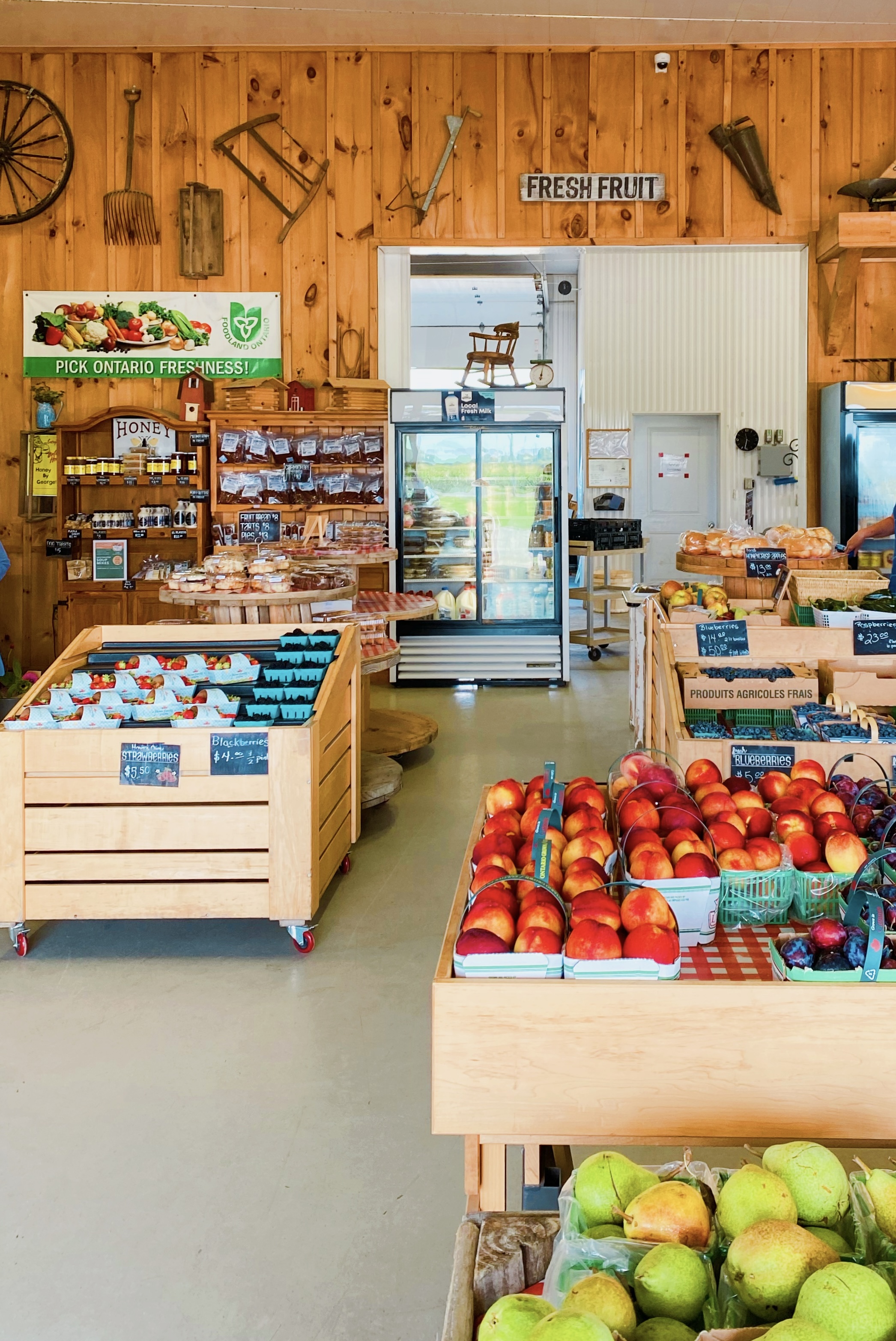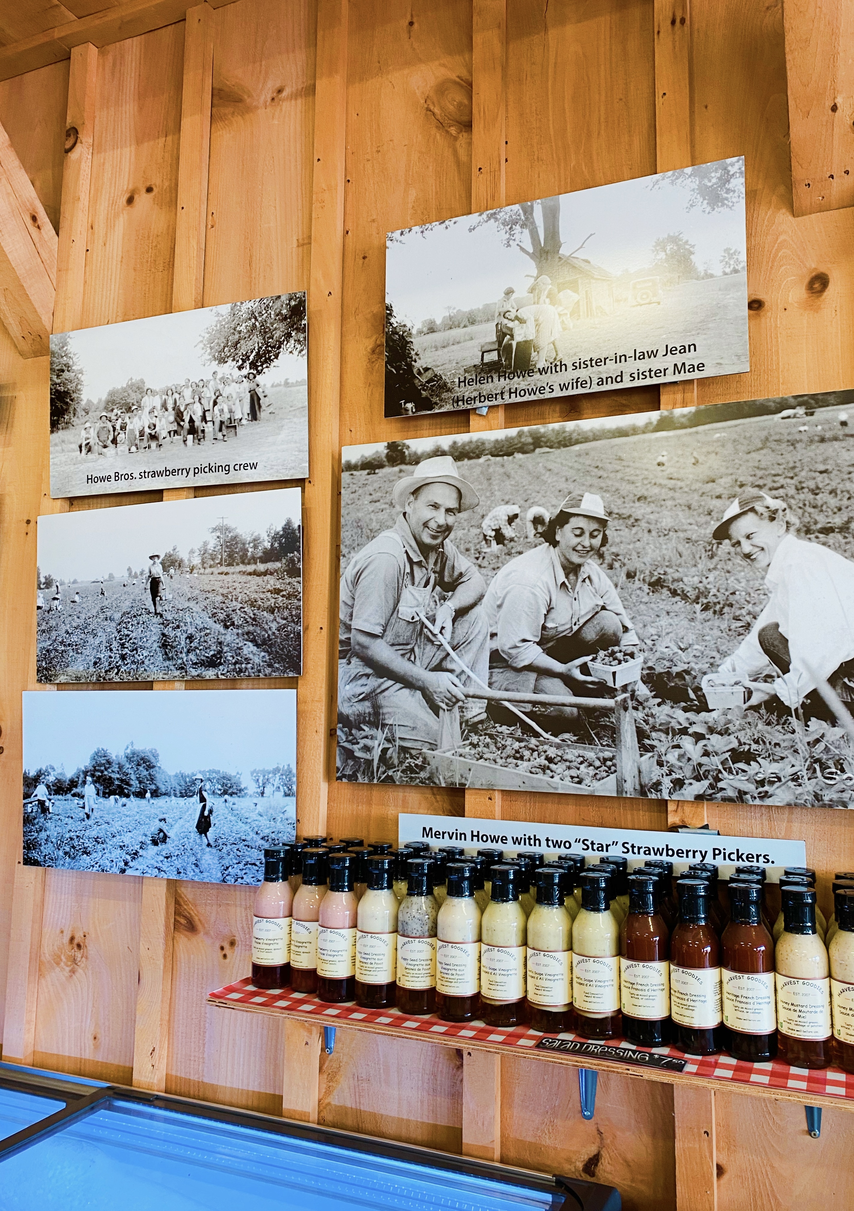 Stepping inside the market feels like taking a trip back in time! Its rustic pine walls are adorned with antique farming tools and black-and-white photographs of the Howe family picking strawberries back in the day. Out in front of the store, there’s a couple of red Muskoka chairs where visitors can relax and enjoy a treat from the bakery.