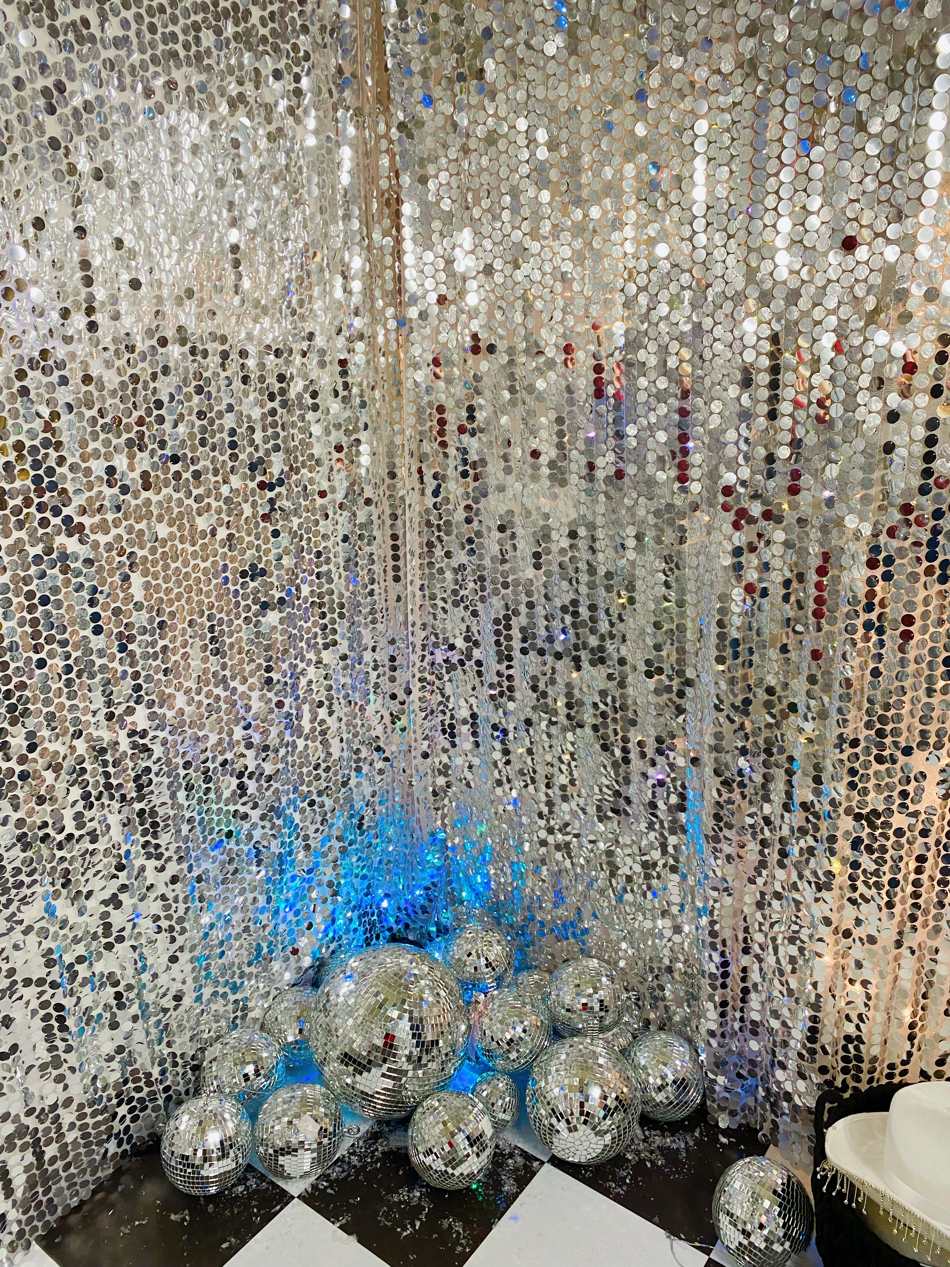 My favourite room was draped in sparkly silver fabric and had disco balls everywhere – there was even a disco snowman! I was having a little Dolly Parton moment in this bedazzled cowboy hat…