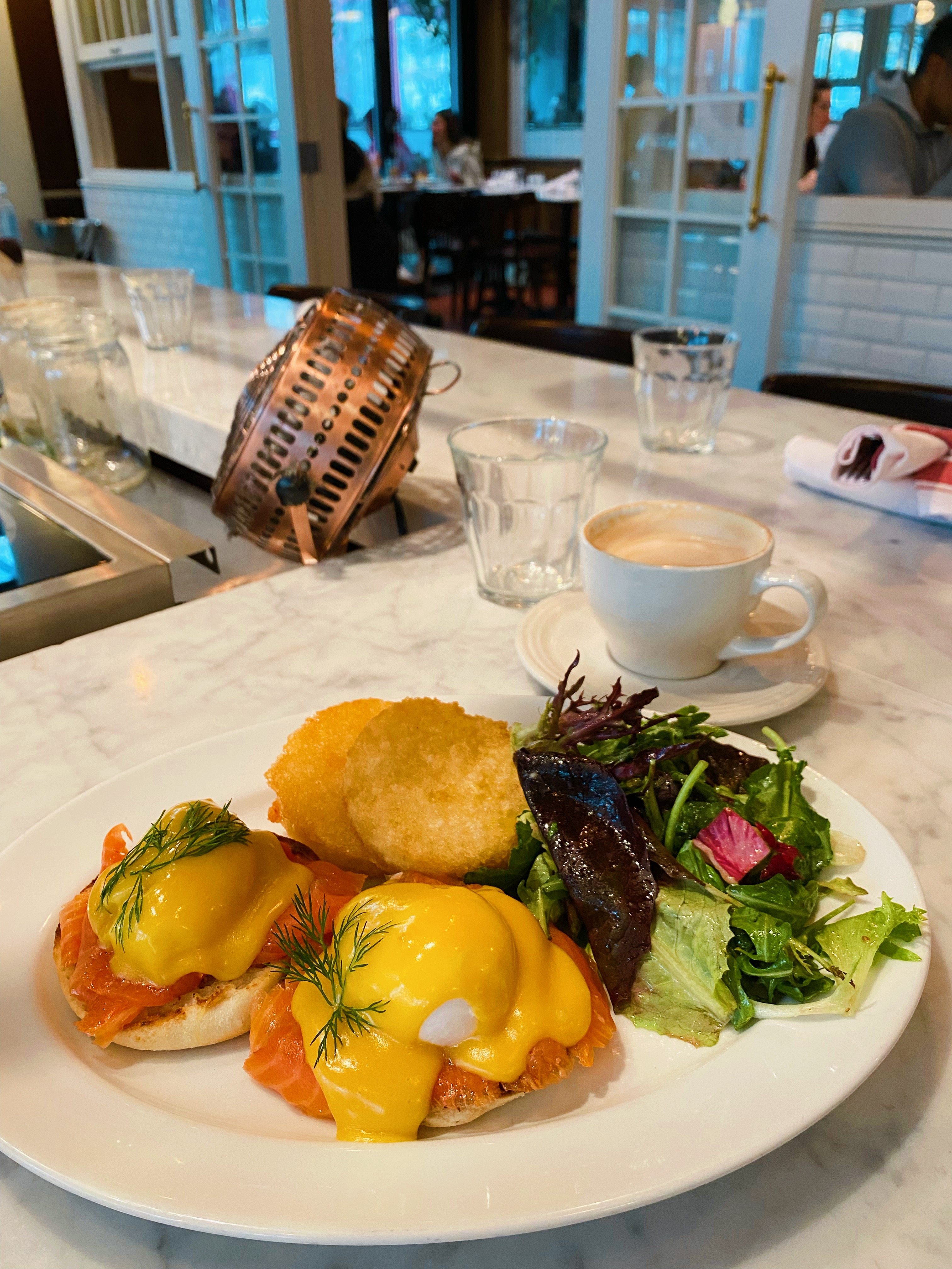 Maxine’s Café & Bar This bustling bistro feels like a little taste of France in Vancouver’s west end. It’s a popular brunch spot and it’s easy to see why: its light-filled interior feels sunny and cheerful, and the decor – which, according to their website, was “inspired by the funky watering holes of Soho and the corner bistros of Europe” – reminds me of a less chaotic version of New York’s famous Balthazar. I grabbed a seat at the bar so I wouldn’t have to wait for a table, but I actually really liked sitting at the bar – it was fun to be where the action was! I ordered a cappuccino and the smoked salmon eggs benedict, which was delicious. In case you haven’t guessed by now, I’m a big smoked salmon fan – and BC is the place to get it! In addition to their famous brunch, Maxine’s is also open for lunch, dinner and happy hour. You can also grab a coffee and pastry to-go from their bakery.
